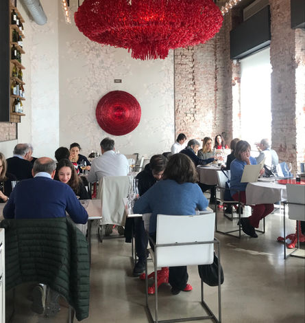 Location: ambiente elegante, adatto a un'occasione speciale. Il locale è minimal ma con dettagli importanti che spezzano l’essenzialità degli ambienti: tavoli e sedute di design in metallo, pareti con mattoni a vista e grandi lampadari in cristallo rosso