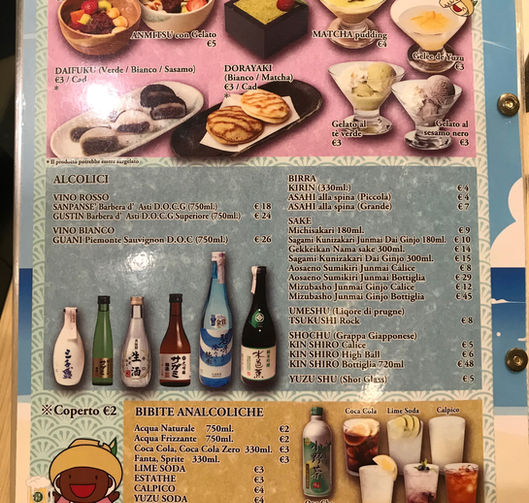Vini e sake: 2 birre giapponesi (Kirin e Asahi Super Dry alla spina), 3 vini italiani, una piccola selezione di sake (vedi foto delle bevande nella gallery)